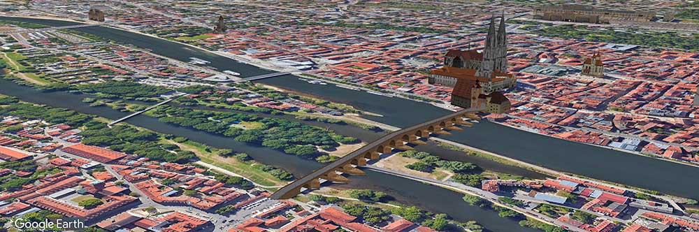 This interactive Google My Map shows locations with information that can be displayed by clicking on the symbols. It has sidebar index and displays best in full-frame by clicking the box in top-right. The map can be used on your phone or tablet when visiting a city, showing you where to go and describing the sights. You are welcome to make a copy as described here. Regensburg can be visited as a daytrip from Nuremberg, 60-minutes by train.