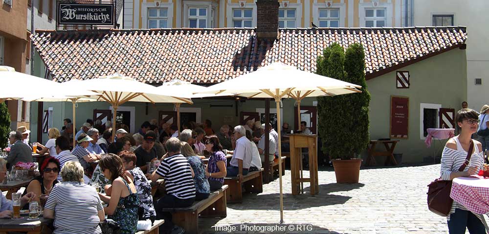 Am Brückturm is the riverside area at the end of the Old Stone Bridge.Visitors can dine outdoors with views of the Danube and the bridge. The area provides a central vantage point for photography and sightseeing. Small shops and restaurants add to the lively atmosphere. It connects directly into the Old Town pedestrian zone.The place is known for the historic Wurstkuchl, considered one of the oldest continuously operating public restaurants in the world, with a history dating back to the 12th century. The restaurant is famous for its grilled sausages, which are served with sweet mustard and sauerkraut. It is a popular spot for both locals and tourists and offers an authentic Regensburg culinary experience in a historic setting.