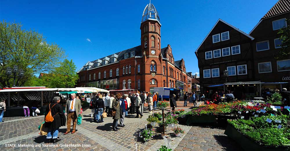 Am Sande creates a lively square with cafes, restaurants, and seasonal events surrounded by historic buildings, often used for outdoor dining and social gatherings. The Stade Market Square functions as a central plaza surrounded by historic buildings that hosts weekly markets, festivals, and public events, serving as both social and commercial hub for the community.