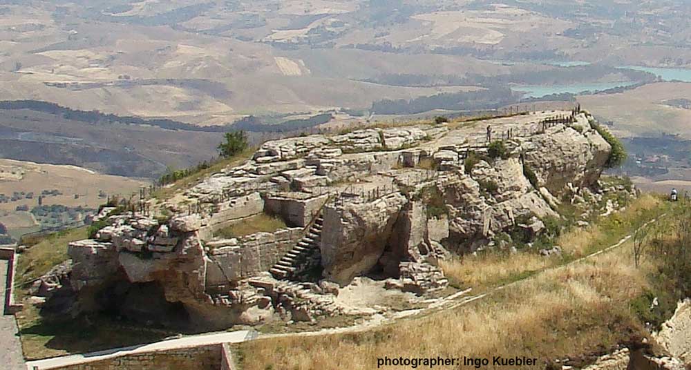 Beyond the castle, the path continues to the Rocca di Cerere, the rocky outcrop at the western extremity of the ridge. This site held the ancient Temple of Demeter, goddess of agriculture and grain, though no visible remains of the temple survive. The position offers another perspective on the surrounding landscape, with valleys extending in multiple directions and the town of Calascibetta visible across a ravine to the north.