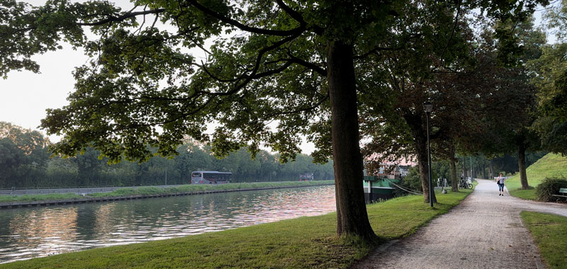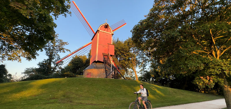 The taxi can bring you to the large Bruges-Ostend canal on the north end of town, with barges that can travel all the way up to the North Sea and into the ocean, connecting Bruges in a maritime highway that reaches the world. You might see a barge coming out of the canal lock, then street gates go up to allow traffic to resume, and you can start walking along the beautiful park next to the canal, looking for windmills.