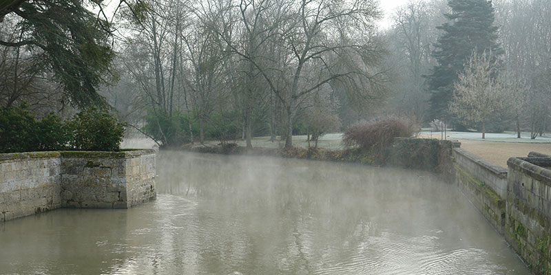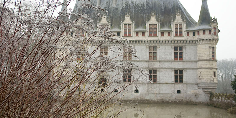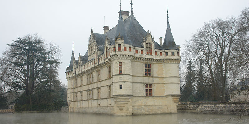 We’re at the Château of Azay-le-Rideau, which is one of the beautiful châteaux of the Loire Valley. It floats like a nest amid reeds, almost buried in luxuriant foliage, with foundations that rise straight out of the water.