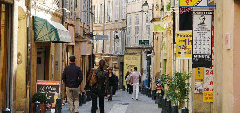 Many of the lanes in the Old Town of Aix are exclusively for pedestrians. But, most of these narrow streets allow some cars to go down the middle and yet it's all very friendly, very casual. The cars go very slowly. And most often you'll find that people are just walking in the middle of those streets anyway, so it's a wonderful kind of a mixed use. Of course the buildings are human scale as well, no higher than five stories throughout the Old Town. There are no skyscrapers, no high-rises in old Aix. And the buildings are arranged together in a medium-density that creates an urban vitality, with shops and cafes lined up next to each other along most of the lanes.