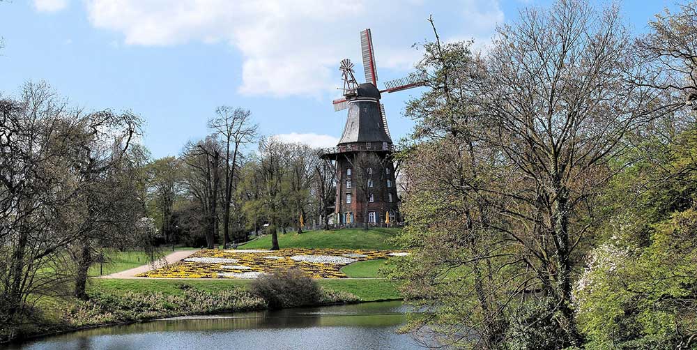 Parks, Gardens, and Green Spaces Bremen is a city of green spaces. The Bürgerpark is a large public park with landscaped paths lakes and recreation facilities, and it has a Vogelhaus with bird enclosures. The Am Wall is a historic defensive wall area with adjacent park spaces and walking paths, including the Wallanlagen Park. The Rhododendron-Park is a park with large rhododendron and azalea collections. The Stadtwald is a forest area with hiking and nature observation trails. The Stadtwaldsee Uni-See is a recreational lake with a beach area near the university. The Werdersee is a large lake near the city center with walking paths swimming areas and picnic spots. Knoops Park is a large English-style landscape park in the Lesum district with gardens wooded areas and Weser River views.