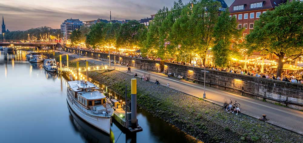 Riverside Culture and Maritime Heritage The Weser River is the lifeblood of Bremen. The Schlachte is a riverside promenade with restaurants and pubs, and it hosts Schlachte seasonal markets, medieval-themed events. The Weser Promenade is a riverside path for walking and cycling with cafes and scenic views. You can also explore the Kaffee-Quartier, preserved coffee warehouses converted to cafes and offices. The Bürgermeister-Smidt-Brücke is a bridge over the Weser River offering views of the waterfront and city skyline. You can walk or cycle along the Weser Promenade and enjoy the scenic views. For a unique experience, visit Café Sand, an urban beach cafe along the Weser River with sand areas for leisure activities. The Weser Skywalk is an elevated viewing platform over the Weser River.