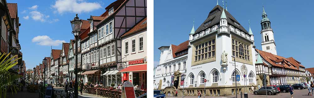 This interactive Google My Map shows locations with information that can be displayed by clicking on the symbols. It has sidebar index and displays best in full-frame by clicking the box in top-right. The map can be used on your phone or tablet when visiting a city, showing you where to go and describing the sights. You are welcome to make a copy, as described here. Celle can be visited as a daytrip from Hannover, 31-minutes by train.