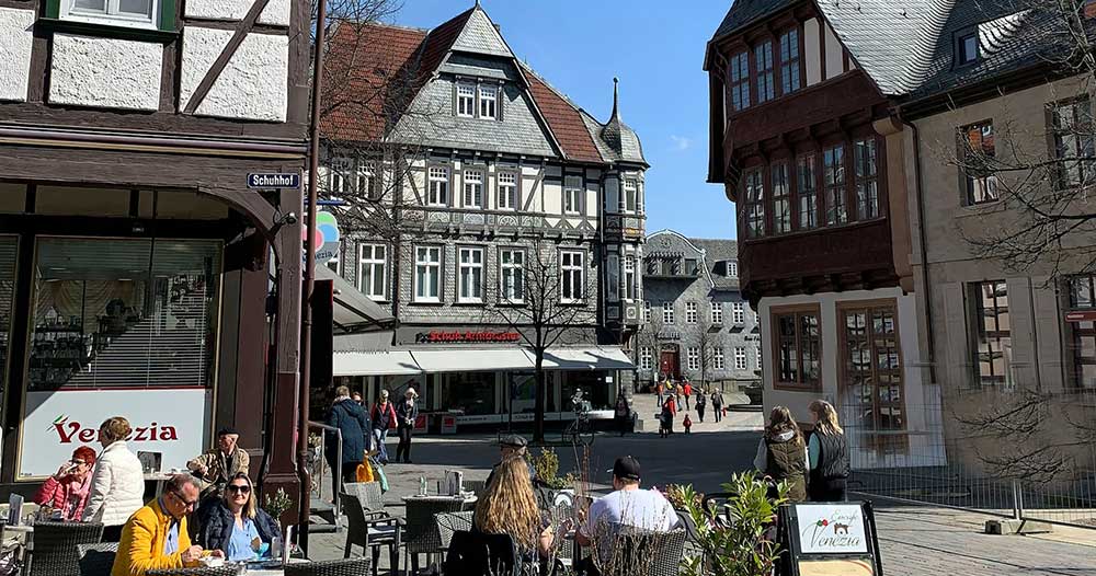 The Goslar Old Town as a whole, with its preserved medieval streets and half-timbered houses, presents a compact historic atmosphere that invites exploration. Bäckerstraße branches from the Market Square, filled with bakeries, cafes, and specialty food shops, its historic name reflecting its long association with Goslar's bakers who once sold bread here. Today it blends culinary tradition with boutique shopping, offering pastries, regional sweets, and souvenirs while timber-framed houses with decorated facades line the cobblestone street.