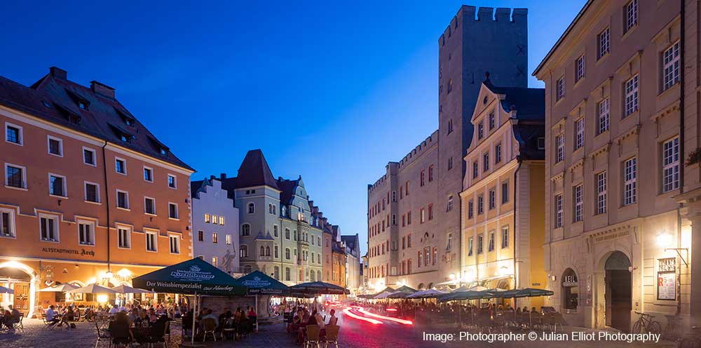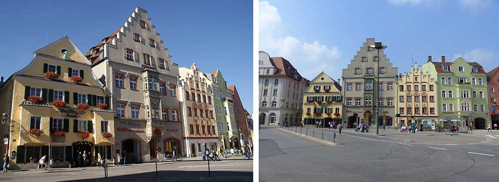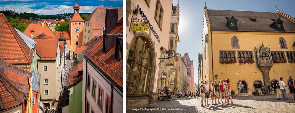 Regensburg is one of Germany’s best-preserved medieval cities, located on the Danube River in Bavaria. It retains the street patterns of a trading city shaped between the 11th and 13th centuries, when the market, City Hall, and cathedral became focal points.