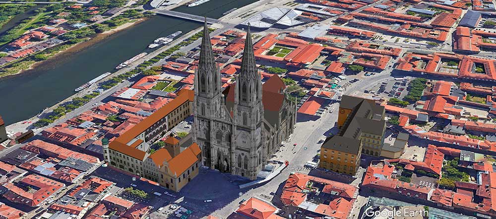 This interactive Google My Map shows locations with information that can be displayed by clicking on the symbols. It has sidebar index and displays best in full-frame by clicking the box in top-right. The map can be used on your phone or tablet when visiting a city, showing you where to go and describing the sights. You are welcome to make a copy as described here. Regensburg can be visited as a daytrip from Nuremberg, 60-minutes by train.
