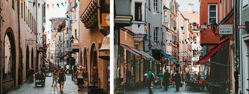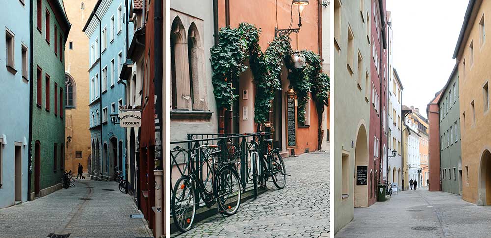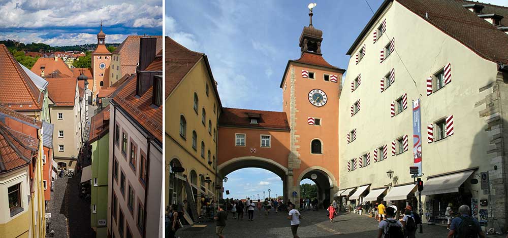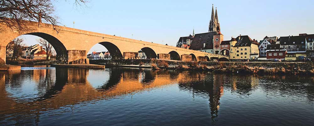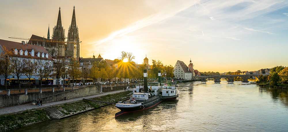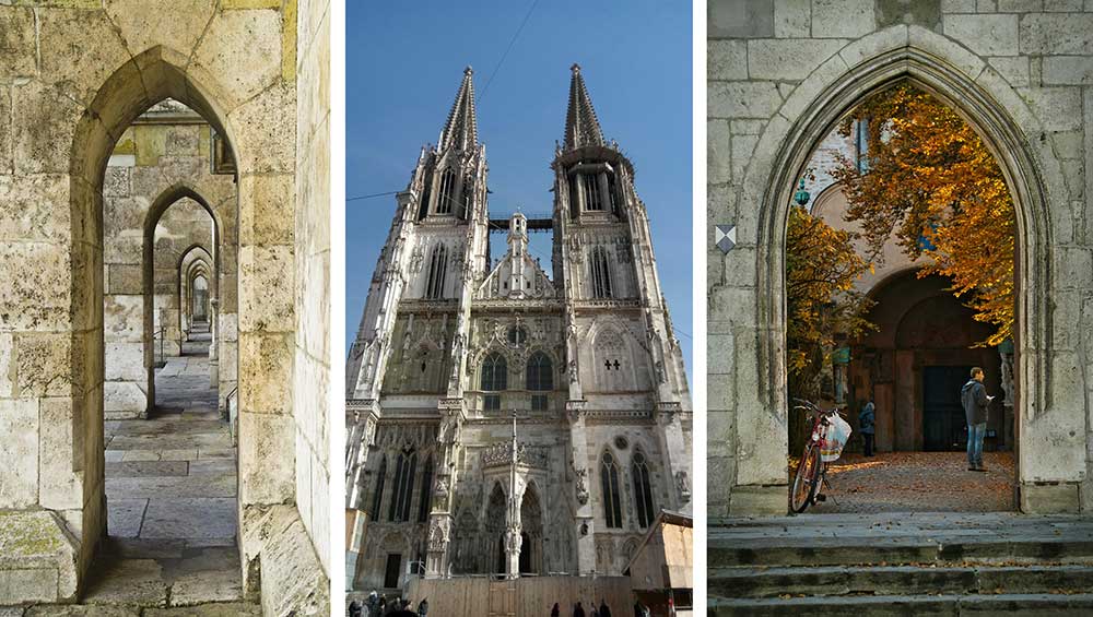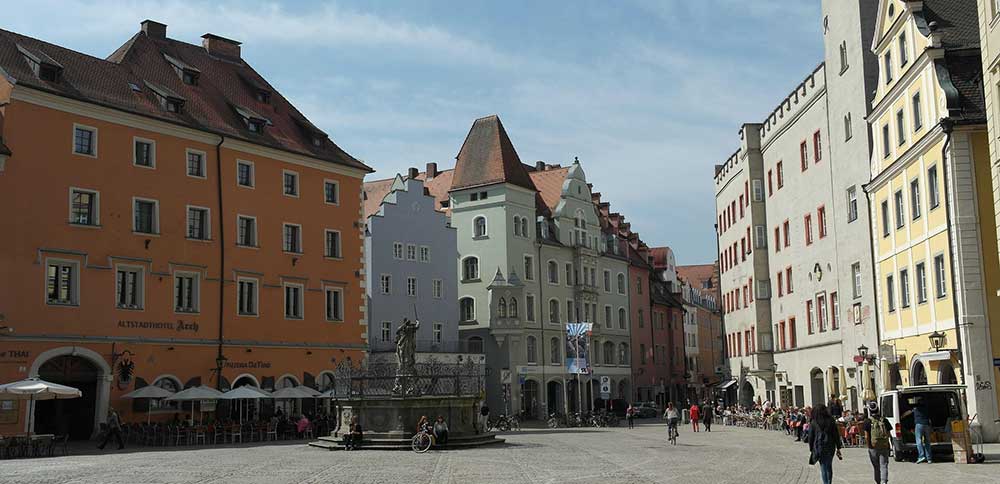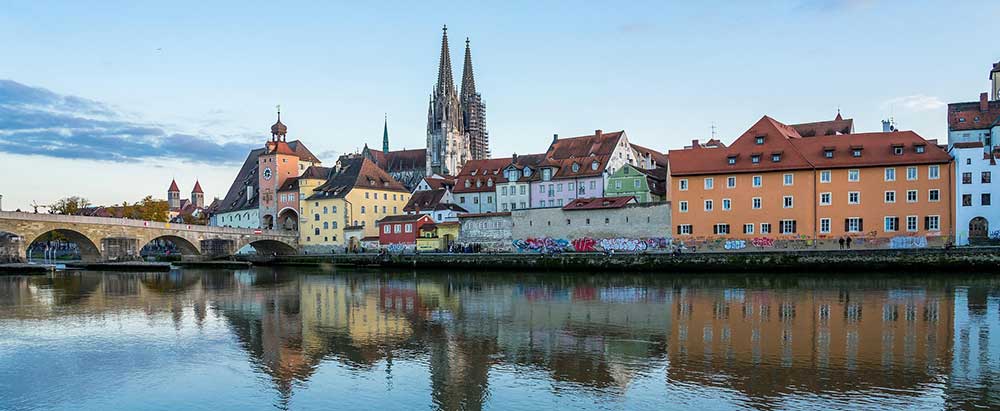 Its history spans Roman times through the Middle Ages to its role as a center of the Holy Roman Empire, with visible remains from each period including Roman ruins, Gothic cathedrals, Renaissance merchant houses, and Baroque civic buildings. The city center features a dense network of pedestrian zones and cobblestone streets that reflect its long history as a trading hub. Key landmarks include the Gothic cathedral with its dominant spires, a 12th-century stone bridge connecting the old town with Stadtamhof district, and patrician towers that showcase medieval merchant wealth.