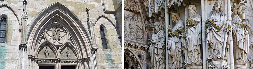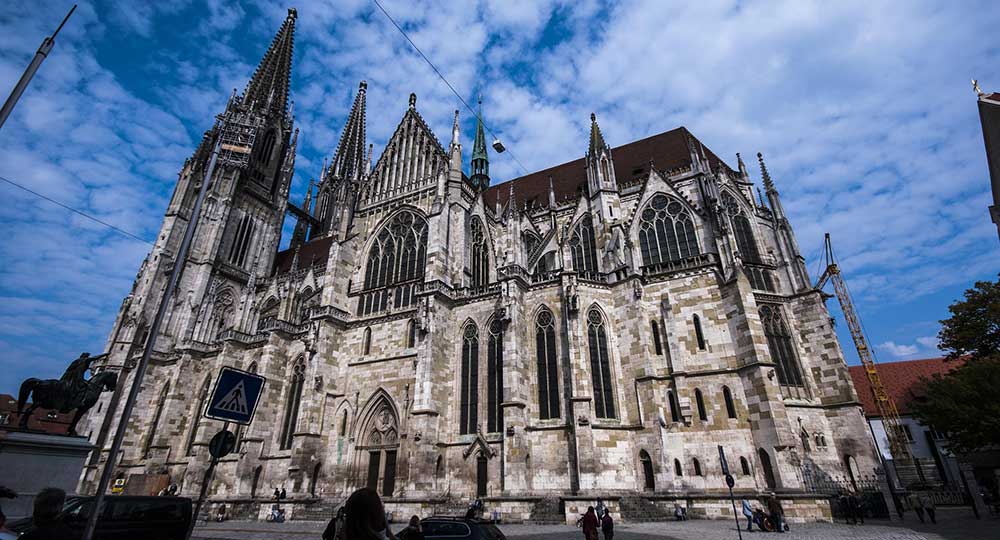 Cathedral of St. Peter The Cathedral of St. Peter is the most prominent religious building in Regensburg and a key example of German Gothic architecture, regarded as the main work of Gothic architecture in Bavaria. Construction began in 1275 and was completed in 1634, with the exception of the twin spires which were finished in 1869, defining the city's skyline and visible from great distances across the Danube valley. It is the city's most prominent religious and architectural landmark. The cathedral's interior features stunning medieval stained-glass windows, intricate stone carvings, numerous historic monuments including masterpieces by renowned sculptors, and a famous "hanging" organ. It serves as home to the Regensburger Domspatzen, an internationally recognized boys' choir that has performed for centuries. The cathedral treasury houses an extensive collection of religious artifacts, vestments, and textiles accumulated over centuries of ecclesiastical history. The adjoining cloisters contain two chapels that predate the main cathedral structure, offering visitors a glimpse into the site's earlier religious history.