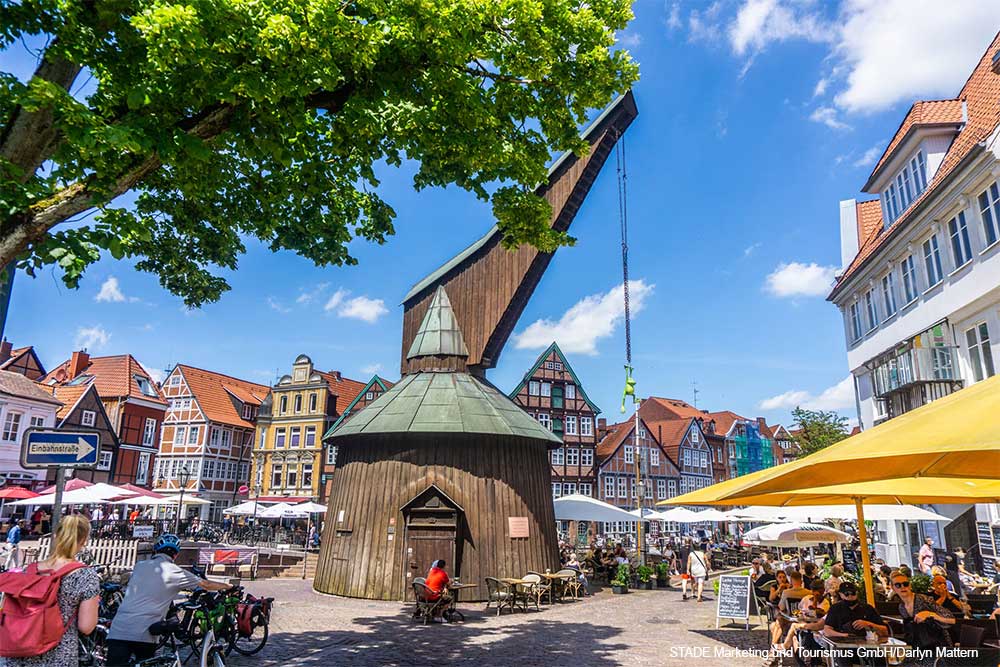 Am Sande creates a lively square with cafes, restaurants, and seasonal events surrounded by historic buildings, often used for outdoor dining and social gatherings. The Stade Market Square functions as a central plaza surrounded by historic buildings that hosts weekly markets, festivals, and public events, serving as both social and commercial hub for the community.