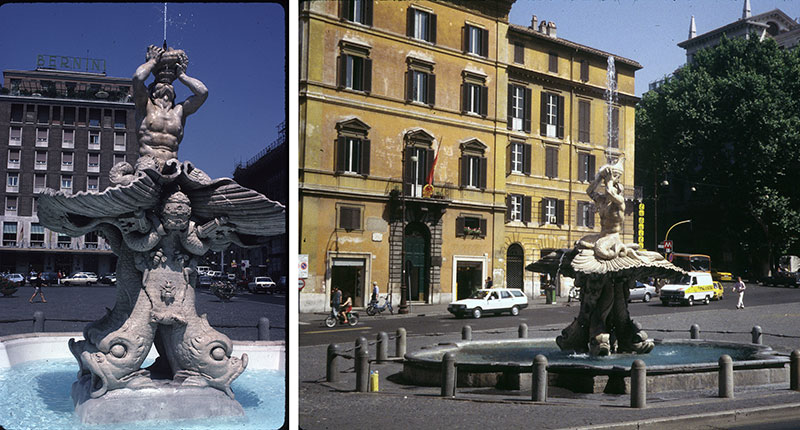 The Trident comes together at the almost-twin Baroque churches on one side of the Piazza del Popolo. The other side of this vast plaza is home to Rome’s earliest domed Renaissance church, Santa Maria del Popolo. The piazza is bounded on east and west by curved walls with groups of Neptune and Tritons, and of Roma between the Tiber and the Anio.