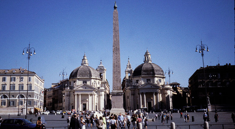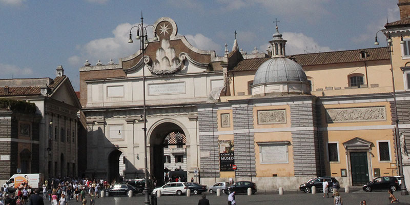 The monumental Porta del Popolo gateway on the north side of the piazza was constructed in 1562 by Vignola on the site of the Porta Flaminia of Aurelian’s wall. The side towards the town was added by Bernini in 1655, as part of the Catholic celebration to welcome Sweden’s Queen Christina, who had just shocked northern Europe with her abdication and conversion to Catholicism, a major triumph of the Counter Reformation. In 1878 the gate was enlarged by the addition of two side-portals.