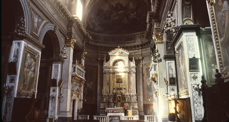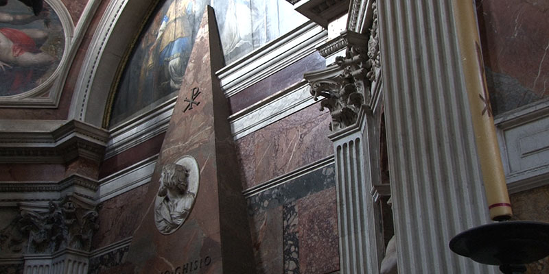There are two major paintings by Caravaggio in a side chapel; an altarpiece by Annibale Carracci; a chapel by Fontana; tombs by Sansovino; and architecture by Bramante.