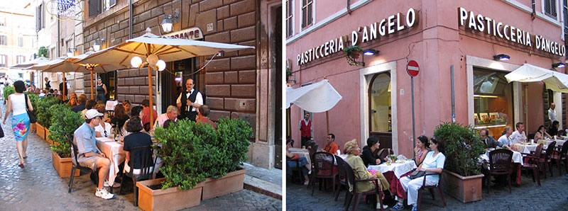 For light refreshments, try Rosati or Canova, two of Rome’s grand old cafes on the piazza, or have dinner at Dal Bolognese. A nearby family-operated trattoria, La Buca di Ripetta, would also feed you very well. The 5-star Hotel de Russie at the top of Via del Babuino has an outstanding restaurant set in their garden courtyard, and deluxe toilets in the lobby.