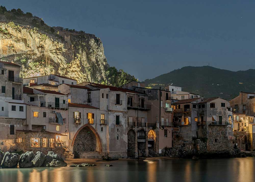 Cefalù occupies a narrow strip of land pressed between the Tyrrhenian Sea and the massive limestone promontory of La Rocca on Sicily's northern coast. The town's Norman cathedral rises against the base of this 270-meter rock face, establishing a visual relationship between human construction and natural formation that defines the settlement's character. Medieval streets extend from the waterfront through the historic center, maintaining their original narrow dimensions and irregular paving while accommodating contemporary commercial activity and residential life.