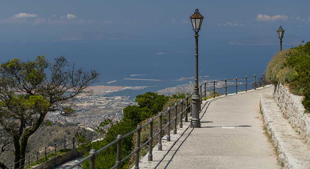 The Balio gardens adjacent to the castle provide landscaped public space with terraced walkways, ornamental plantings, and stone balustrades framing views that extend across western Sicily to Trapani far below, the geometric patterns of the salt pans spreading along the coast, and the Egadi Islands floating in the blue Mediterranean. On exceptionally clear days the vista reaches southeast across the interior mountains and northwest toward the Tunisian coast, demonstrating the geographic position that made Erice strategically valuable throughout its history.
