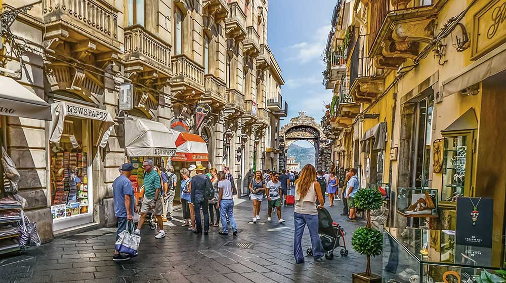 Taormina perches on a hillside terrace two hundred meters above the Ionian Sea, a position offering defensive advantage and spectacular views. The Greek Theater occupies the most dramatic location where the ancient cavea frames Mount Etna and the coastline beyond the stage, creating theatrical backdrop that combines architecture with volcanic and maritime scenery. The medieval town extends along a single ridgeline street, Corso Umberto, connecting two city gates a kilometer apart. This pedestrianized thoroughfare concentrates tourist activity along a linear route where nearly every building serves commercial functions.