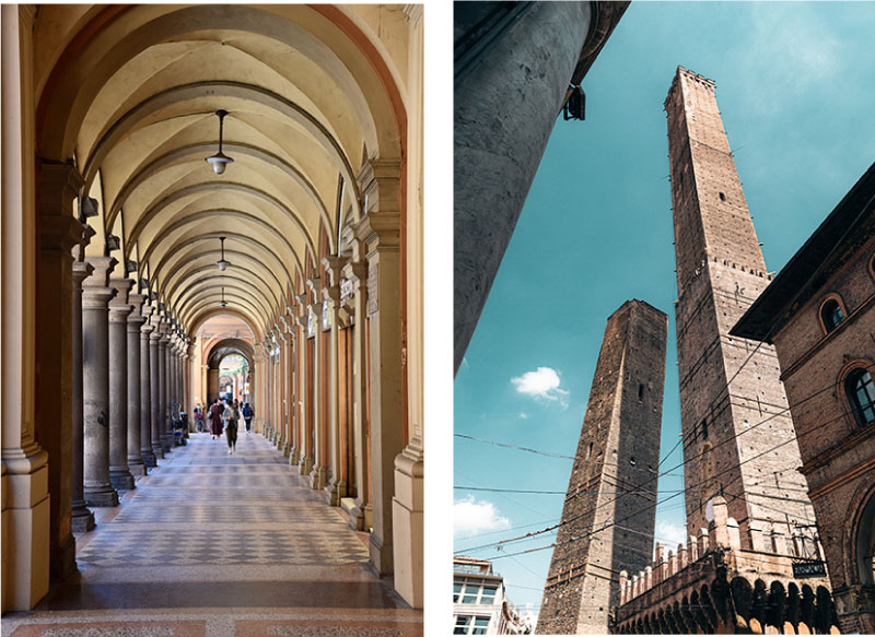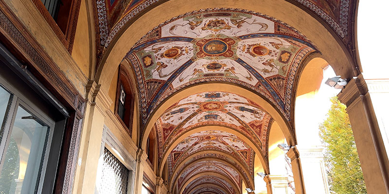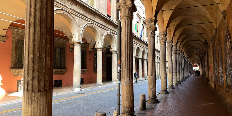 Porticoes can line a street as a roof structure over a walkway, or they can just be a porch leading to the entrance of a building. But here in Bologna, it's all about creating those sheltered walkways along the street, which has been done here more extensively than any place else.