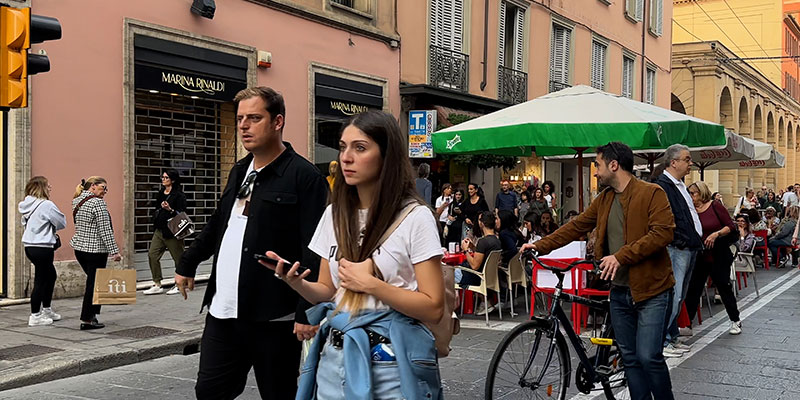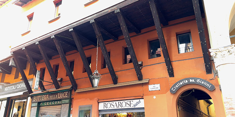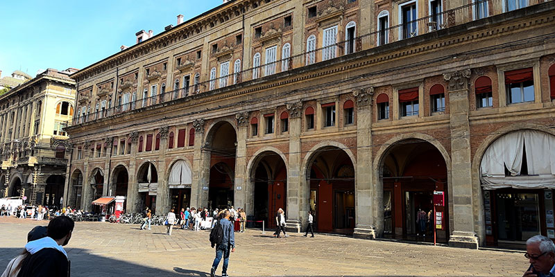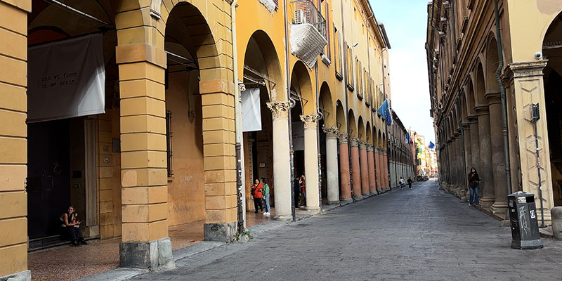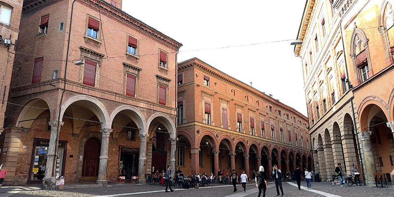 You can get around for a good view of the porticoes by either walking, maybe rent a bicycle, or take the tourist tram, which provides a little one-hour round-trip through the center of town, giving you access to see many different kinds of porticoes. This will drive you along one of the main streets of downtown, which follows the path of an original ancient Roman road, the Via Emilia, which now changes names from Ugo Bassi to Rizzoli and Strada Maggiore.