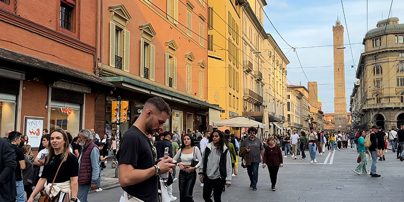 The conversion of this busy street into a pedestrian mall, even though it's just on the weekends, is a fine example of the movement towards complete streets. This tram ride does make it easy to get around, especially convenient right here in this busy neighborhood as we roll along right into the heart of downtown and look up for a view of the Asinelli Tower, at 97.2 meters high, the tallest medieval leaning tower in the world. We are reaching the end of this busy street now called Via Rizzoli, and it widens into a bit of a piazza with protective barriers, and now the sidewalks are once again covered by porticoes.