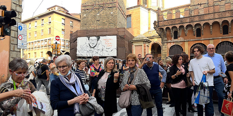 This tourist tram is about the only motorized vehicle you'll see on the main streets here, because I'm here on a weekend. And on Saturday and Sunday, Bologna closes off most of the center to all traffic, turning the streets over to the pedestrians. This has the effect of converting this major street into a vast piazza. Many cities are struggling with traffic congestion, too many automobiles, and trying to find a way to make the streets more friendly to pedestrians. Well, here is a fine example, which is a big bonus for the visitor, because walking is always the best way to see a place.