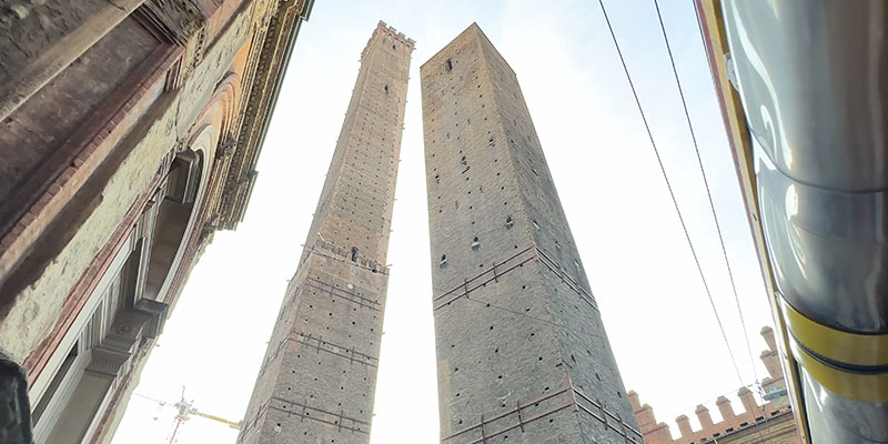 This Piazza della Mercanzia is located at a busy intersection which had been the crossroads of the two main Roman streets back in the ancient days, one street leading onto Rimini and the other street leading on to Ravenna. Here you can see the foundation of the two tall towers, Garisenda at 48 meters high, Asinelli towering above that 97.2 meters. Back in the Middle Ages, Bologna was full of these towers, but now there are just 20 of them left.
