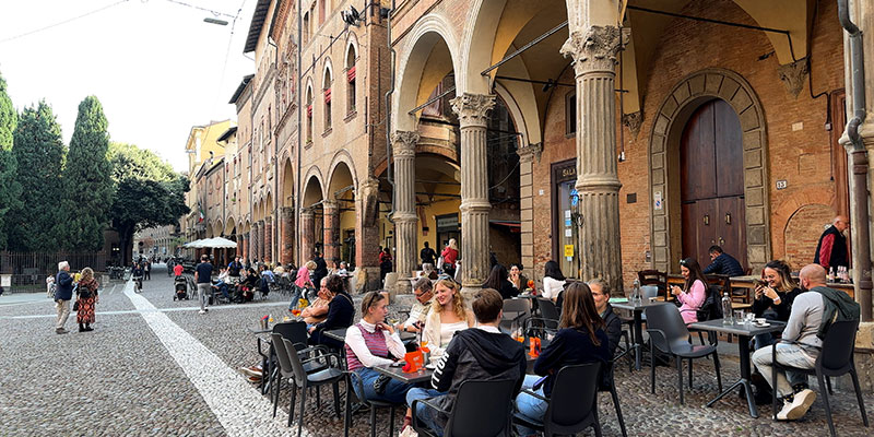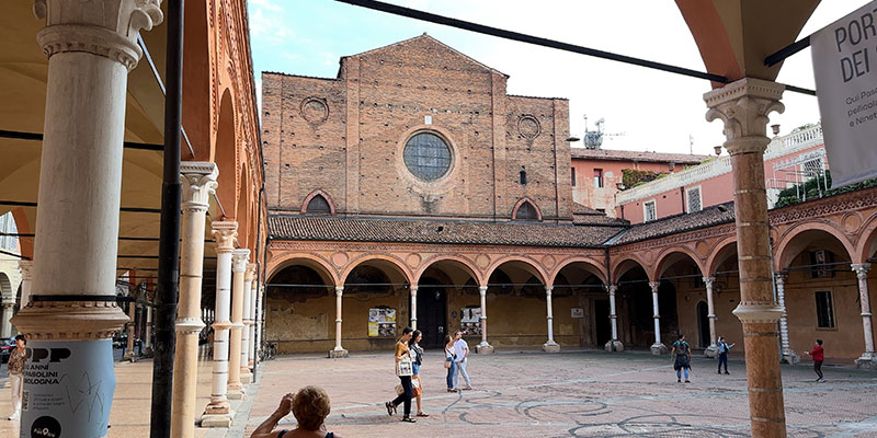 Porticoes also provide a comfortable setting for the numerous outdoor cafes and restaurants that you'll find throughout the city. You will often see the restaurant expanding out beyond the portico into the adjacent street or piazza, creating additional useful spaces which give customers the choice to sit indoors or under the portico or out in the open. A fine example of that is the very popular Piazza Santo Stefano, which has a triangular shape with porticoes on two sides of medieval and Renaissance origin, and the Church of Santo Stefano at the end with seven churches inside it, including an octagonal portico in one of the ancient churches and a beautiful cloister surrounded by two levels of columns and arches.