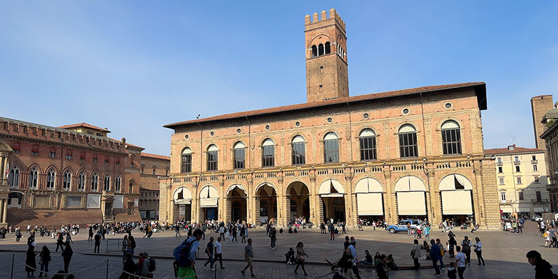 The largest piazza in town, just a few blocks away, is Piazza Maggiore, with more porticoes along several of the most important buildings in Bologna. The main square of Bologna is always a busy place, daytime and right into the evening. It's surrounded by the big church, the town hall, cafes and little lanes leading off from it that have many restaurants, lots of outdoor eateries. It's an amazing busy place.