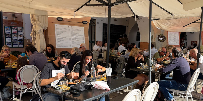 There has been some kind of bakery on this site for over a century. It became Revello about 60 years ago, featuring sweet and savory Ligurian specialties, including their famous pastry, the Camoliesi al rum. It's a bakery that does not make bread, but focaccia. You will always have places to eat here, especially lovely with that outdoor ambiance.
