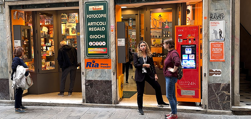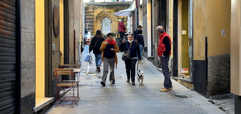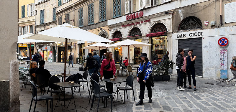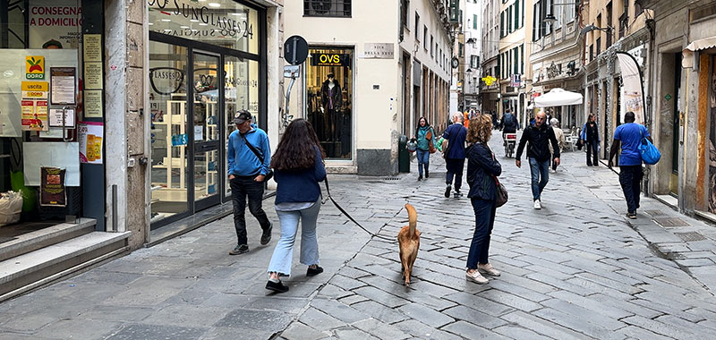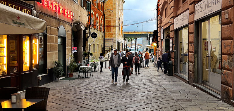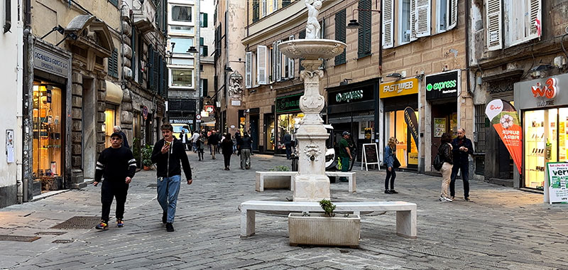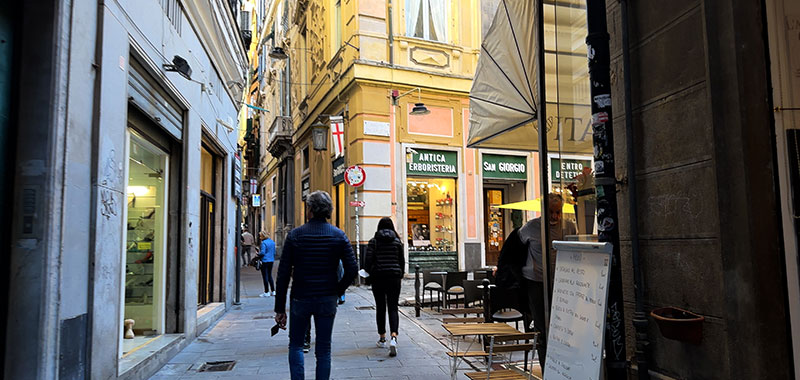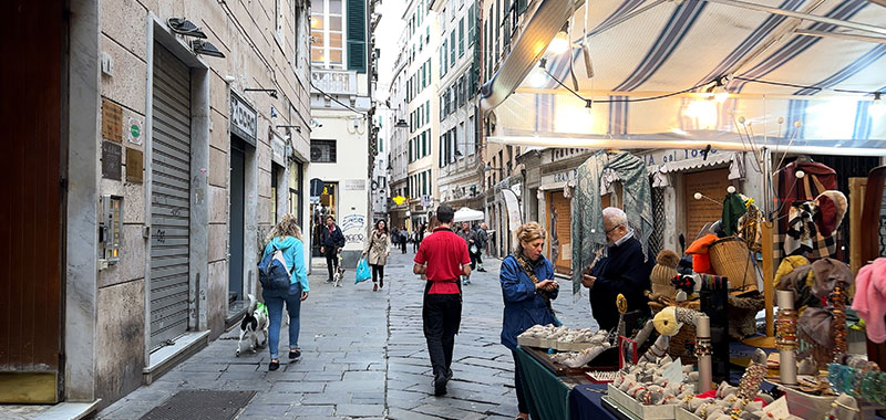 In addition to walking the main route, we'll stop at several little piazzas and look at the side streets that connect with it: Salita di Portafico, Vico Superiore del Ferro, Salita Pallavicini, Vico della Casana, Vico del Fieno, Via dei Macelli di Soziglia, Via San Luca. This pedestrian street is family-friendly, filled with all sorts of local people out for a stroll, and lined with many shops and restaurants.