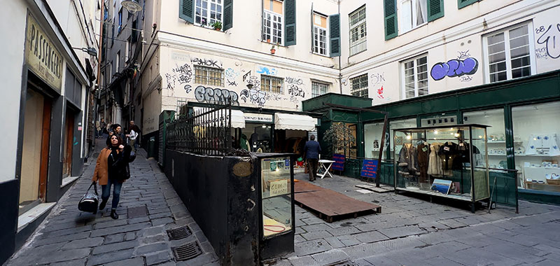 Via Luccoli now becomes Piazza di Soziglia, which is at the very center of our street and is the heart and soul of the neighborhood, with its bustling outdoor market that appeals to locals and visitors alike. Kicconero Cafeteria serves delicious coffee and pastries, with a statue on the façade above it that is a small shrine to Saint John the Baptist, the patron saint of Genoa. We entered the piazza from Via Luccoli, on the right side of the cafeteria. On the left side, there is a major side lane that is worth a look.