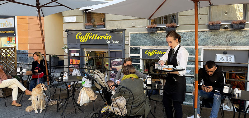 This walking tour starts at Piazza delle Fontane Marose, which has several UNESCO World Heritage Palaces. Because we are starting the walk on the piazza in front of Cafeteria San Giorgio, this would be an excellent place to get a cup of coffee and give us a jolt of energy to power through the walk. Aah, some cappuccino, delightful at a friendly place like Cafeteria San Giorgio.