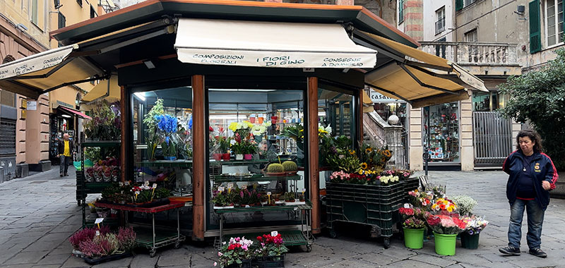 The first of the side lanes is called Salita di Portafico. Salita means "climb" because many of these side lanes go uphill. Along Via Luccoli, there is a small Piazza Luccoli, with outdoor tables in the center and shops around it. Another side lane leads off, heading towards Piazza del Ferro.