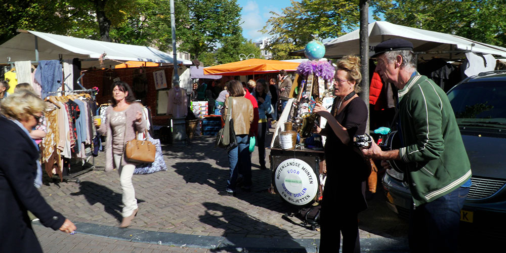 Right alongside the Prinsengracht you'll find one of Amsterdam's many lively street markets, Noordermarkt, and sometimes you'll get jazzy street entertainment. Every Monday morning it's a fleamarket selling fabric, some food, secondhand clothing, old shoes, records, etc. and on every Saturday, it's a biological food market selling a wide range of ecological products like organic fruits and vegetables, herbs, mushrooms and cheese.