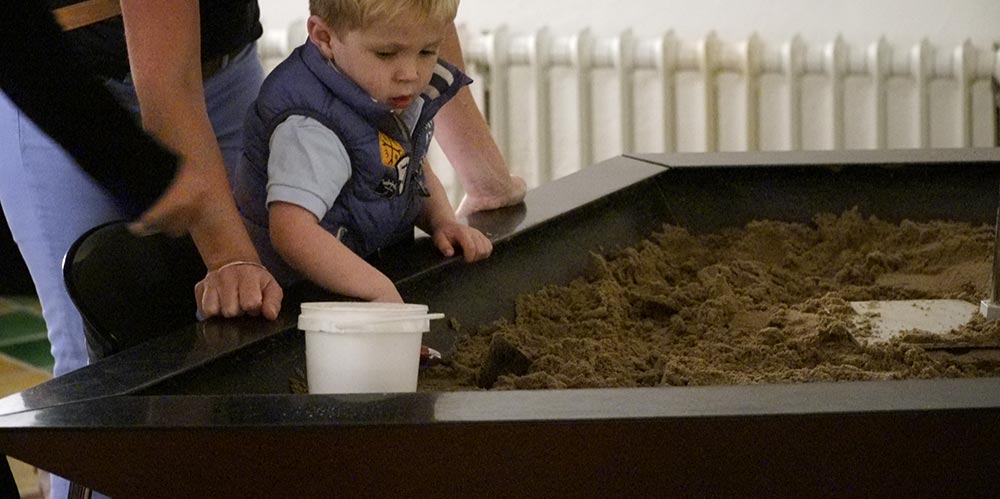There is a sandbox for kids to play in, like a little archaeology dig, where they can scoop dirt up into a bucket.