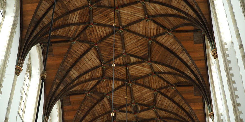 The ceiling at the crossing is made of stone, but the rest of the roof is cedar wood, held up by 28 high stone columns, without any flying buttresses. The church is 460 feet long in a Latin cross layout with the tower 262 feet high. The lower part of the church is of brick and the upper walls, of stone. Even if the big organ is not being played during your visit, someone is often practicing on the smaller organ.