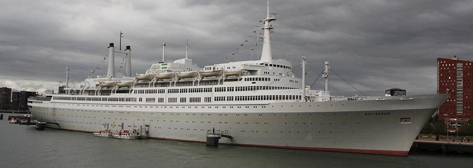 We’re coming up on a most unusual-shaped building with a strange top that sticks out. This is the Shipping and Transport College, 65 meters high, and that cantilever portion is a conference room. At this point you have reached the best location for seeing all of the major skyscraper buildings of the city clustered together. You will see them again on the return after passing another great landmark of the harbor, the SS Rotterdam, which began service in 1958 as a transatlantic passenger ship, well before the modern era of mega cruise ships.