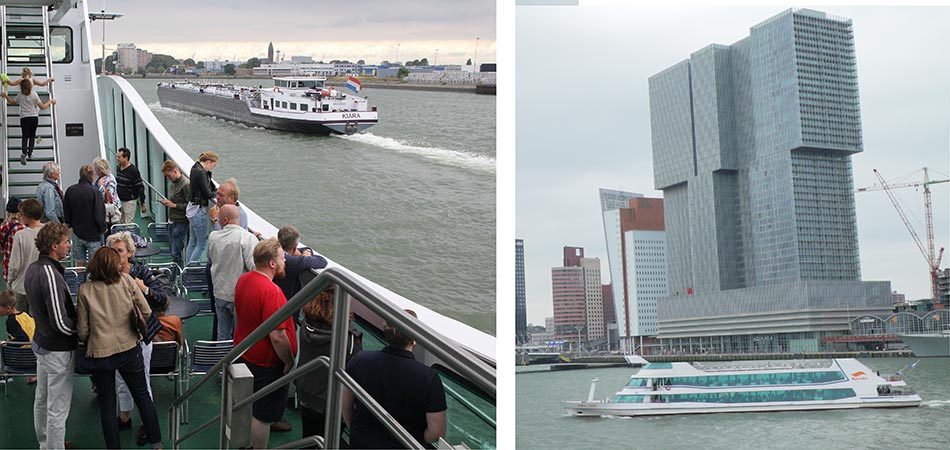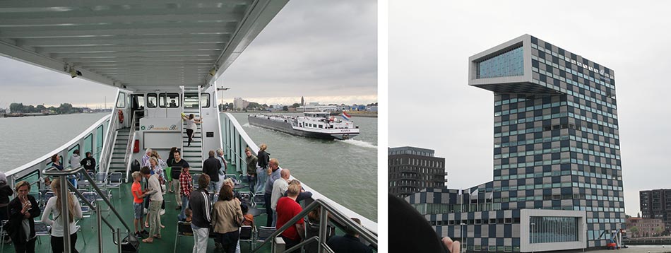 Another huge building coming right up is De Maas glass tower, government headquarters for the Department of Public Works and Water Management. You’ll see lots of other boats buzzing by on the journey, such as water taxis speeding along and typical river cargo ships with living accommodations onboard, similar to what you saw at the Maritime Museum.