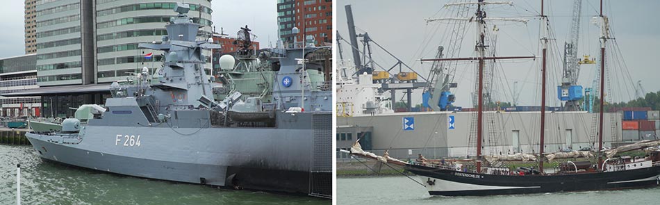 Modern naval ships docked here are quite a contrast with the 100-year-old three-masted schooner, Opsterschelde, which is often cruising in the harbor. Thoroughly renovated in 1988, it sailed around the world two times since then and offers occasional day trips in the Rotterdam harbor and much longer voyages to the North Sea and elsewhere.