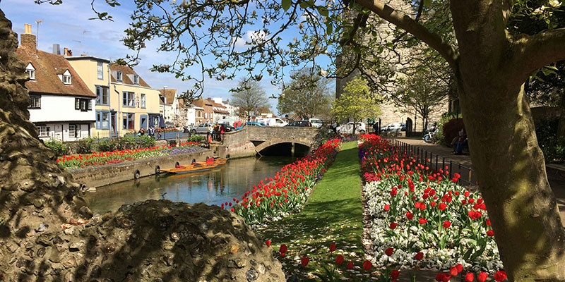 Canterbury, a historic city in Kent, England, is steeped in rich heritage and boasts a captivating blend of medieval architecture, serene gardens, and cultural landmarks. It was a major pilgrimage site in the Middle Ages, made famous by Geoffrey Chaucer's Canterbury Tales. The city center is encircled by ancient walls, originally built by the Romans, and has cobbled streets lined with timber-framed houses.