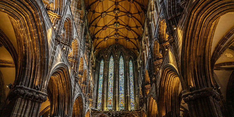 Glasgow Cathedral Glasgow’s oldest structure and Scotland’s only complete medieval cathedral was consecrated in 1197 and dedicated to St Mungo, the city’s patron. The sixth-century missionary, also known as Kentigern, spent 13 years converting Glaswegians. These efforts, along with the deprivations of a life of fasting and prayer in a rock cell, wore the poor fellow out to such an extent that he was forced to wear a bandage to support his chin. Mungo lies amid a forest of pillars in a vaulted crypt beneath the church. The fact he has lain here peacefully through the centuries, and that the church’s beautiful nave and timbered roof are intact, is due, in part, to the courageous intervention of the faithful. During the destruction of churches during the 16th century Reformation, congregants linked arms around the cathedral to prevent mobs from smashing the place to bits. Cathedral Square. Free. Apr–Sept Mon–Sat 9:30am–6pm, Sun 1–5:30pm; Oct–Mar Mon–Sat 9:30am–4pm, Sun 1–4pm.