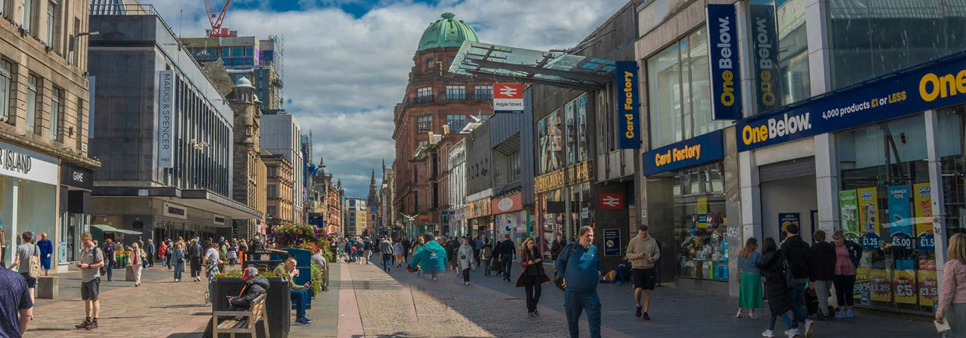 Sauchiehall Street, rather refreshingly lowbrow with bargain shops and outdoor vendors, running east–west through the north end of the City Center; and