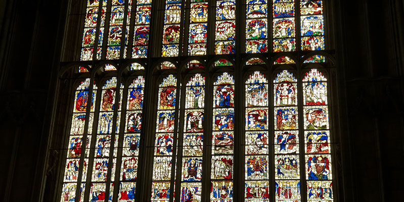 The window with five long sections of glass was built in 1405 and later called the "Five Sisters". The window on the east end in the Ladies Chapel contains 100,000 pieces of glass, making it the world's largest stained glass from the Middle Ages. The stained-glass is especially important with a total of 128 windows making up the largest collection of medieval glass in the world containing a total of about 2 million individual pieces.