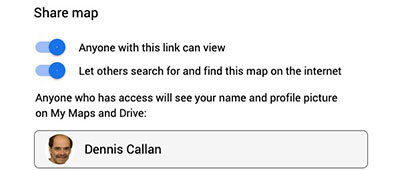 In the map you want to share, at the top of the column on the left side just above your list of places, click the Share icon. Select how you want to share your map. Follow the onscreen instructions. It’s best to toggle on both choices so all can have access to the map. Be generous, and you will also benefit from others who share their maps as explained below.