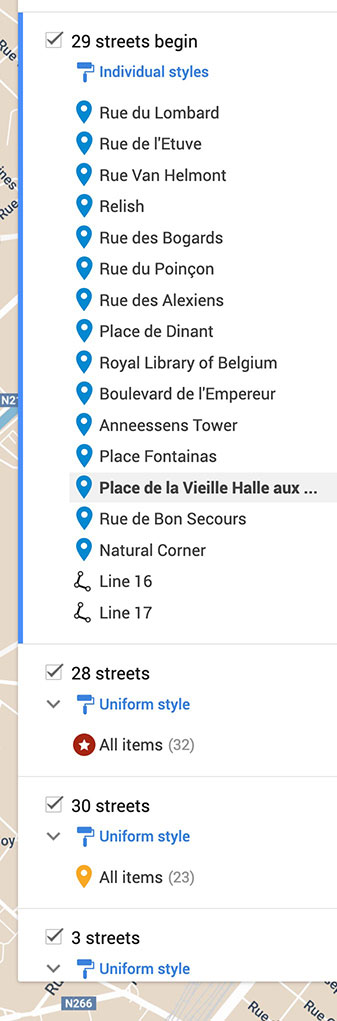 Create your lists of places using AI and basic research, with individual lists for each of your themes, like restaurants, monuments, shops, plazas, hotels, etc. As seen in the graphic on the left, these places will show up in the map sidebar as a list of clickable pins which take you to those locations.
